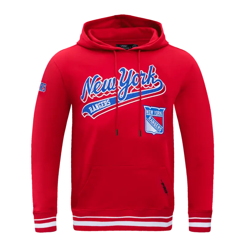 NHL NEW YORK RANGERS SCRIPT TAIL MEN’S RIB FLEECE PULLOVER HOODIE (RED)